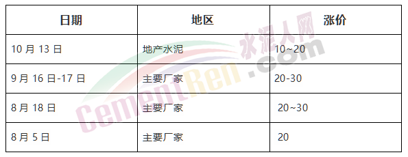 下半年以來,河南地區主要品牌企業已經連續八輪連漲累計上調最高達170~260元/噸,僅8月中旬到9月初水泥價格連續推漲四輪,幅度高達100~120元/噸。