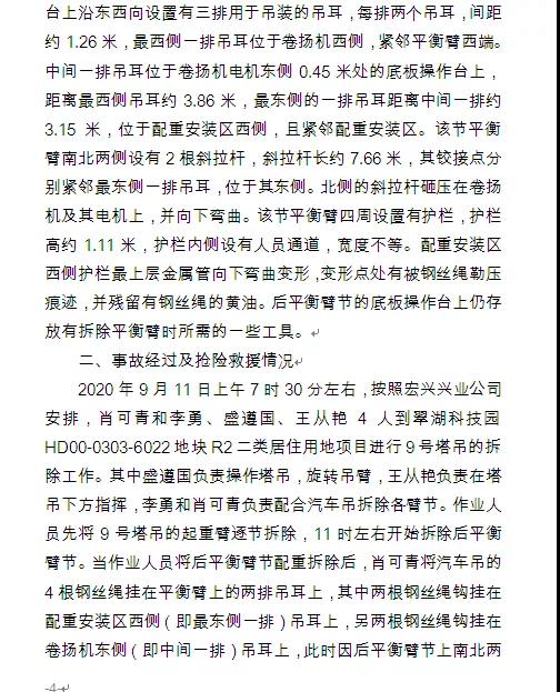 事故報(bào)告顯示,事故直接原因?yàn)樾つ嘲踩庾R(shí)淡薄,未經(jīng)安全教育培訓(xùn)、未取得建筑起重機(jī)械安裝拆卸工特種作業(yè)資格,違規(guī)從事塔吊拆除作業(yè),錯(cuò)誤選擇后平衡臂節(jié)起吊吊點(diǎn),引發(fā)后平衡臂節(jié)傾翻,導(dǎo)致事故。