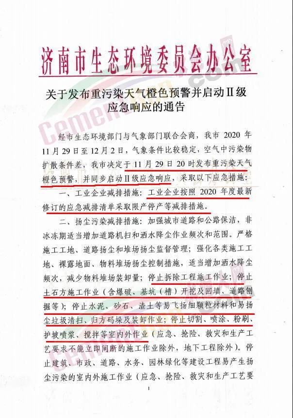 同日,日照市重污染天氣應急指揮部辦公室發布重污染天氣黃色預警啟動Ⅲ級應急響應的通知稱,根據市污染防治攻堅戰集中攻堅行動工作專班辦公室專家團隊分析研判和建議,日照市重污染天氣應急指揮部決定自2020年11月29日12時發布重污染天氣黃色預警,11月30日12時啟動Ⅲ級應急響應。強制性減排措施要求:(一)納入應急減排清單的工業企業嚴格依法落實重污染天氣應急預案、應急減排清單確定的減排措施。(二)礦山、砂石料場、石材廠、石板廠等停止露天作業。(三)未納入保障類減排清單的施工工地禁止土石方作業、建筑拆除、噴涂粉刷、護坡噴漿、混凝土攪拌等。(四)全市主要道路落實深度保潔措施,確保路面不起塵。灑水降塵作業應根據雨雪、冰凍等特殊氣象條件,進行科學調整。(五)未安裝密閉裝置易產生遺撒的煤炭、渣土、砂石料等運輸車輛禁止上路。(六)除城市運行保障車輛和執行特種任務車輛外,城市主城區、縣城區內禁止低速載貨汽車、三輪汽車、拖拉機等通行。(七)港口碼頭停止木薯干、粉煤、粉礦等極易起塵物料作業。(八)嚴格落實煙花爆竹禁放措施。