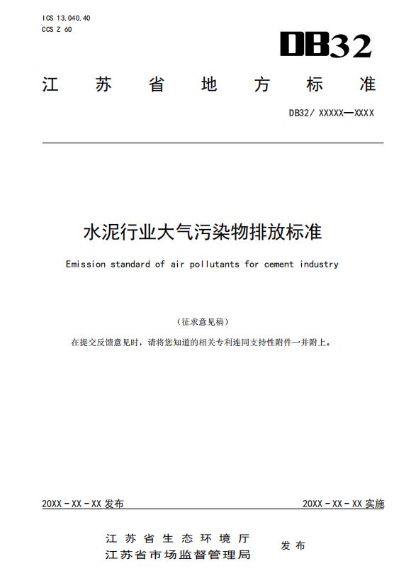 日前,江蘇省生態環境廳發布關于征求地方標準《水泥行業大氣污染物排放標準(征求意見稿)》意見的函稱,為貫徹《中華人民共和國環境保護法》、《中華人民共和國大氣污染防治法》、《江蘇省大氣污染防治條例》,加強大氣污染物排放控制,江蘇省生態環境廳組織起草了地方標準《水泥行業大氣污染物排放標準(征求意見稿)》。