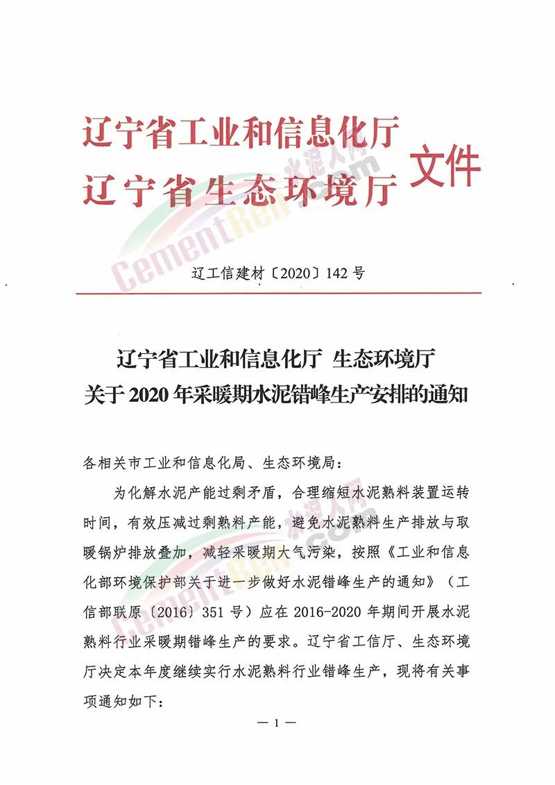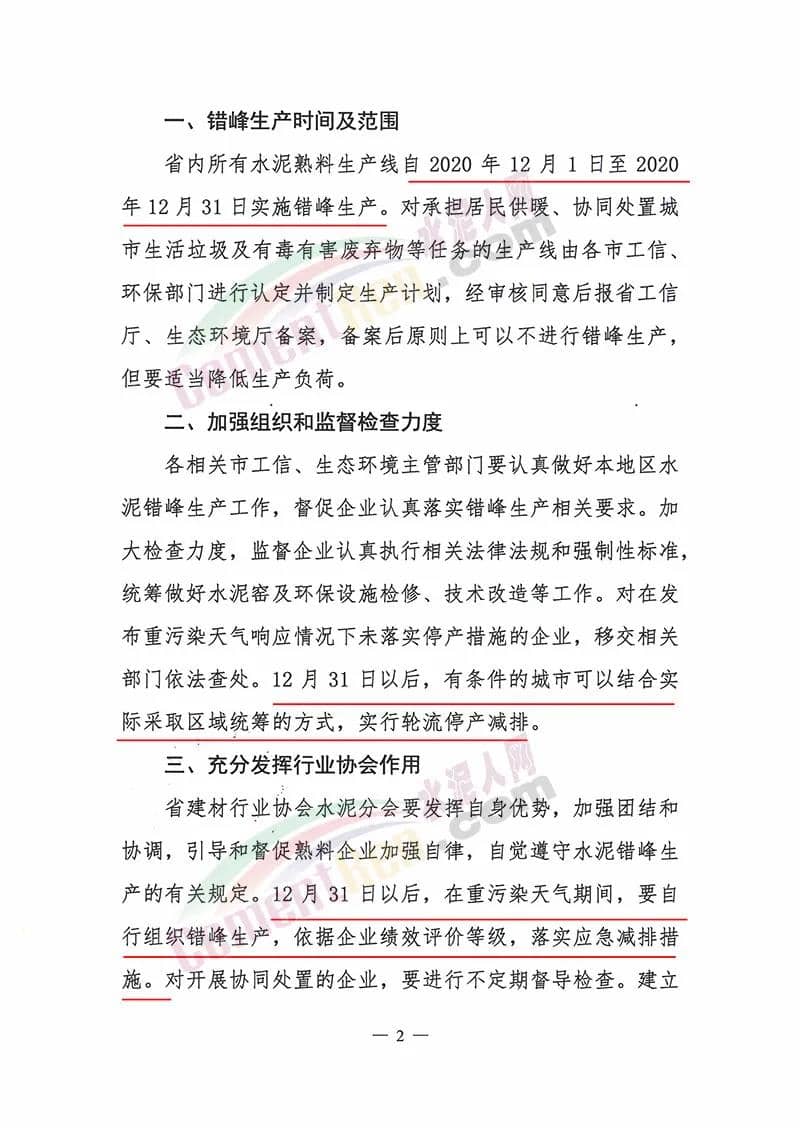 省內所有水泥熟料生產線自2020年12月1日至2020年12月31日實施錯峰生產。對承擔居民供暖、協同處置城市生活垃圾及有毒有害廢棄物等任務的生產線由各市工信、環保部門進行認定并制定生產計劃,經審核同意后報省工信廳、生態環境廳備案,備案后原則上可以不進行錯峰生產,但要適當降低生產負荷。
