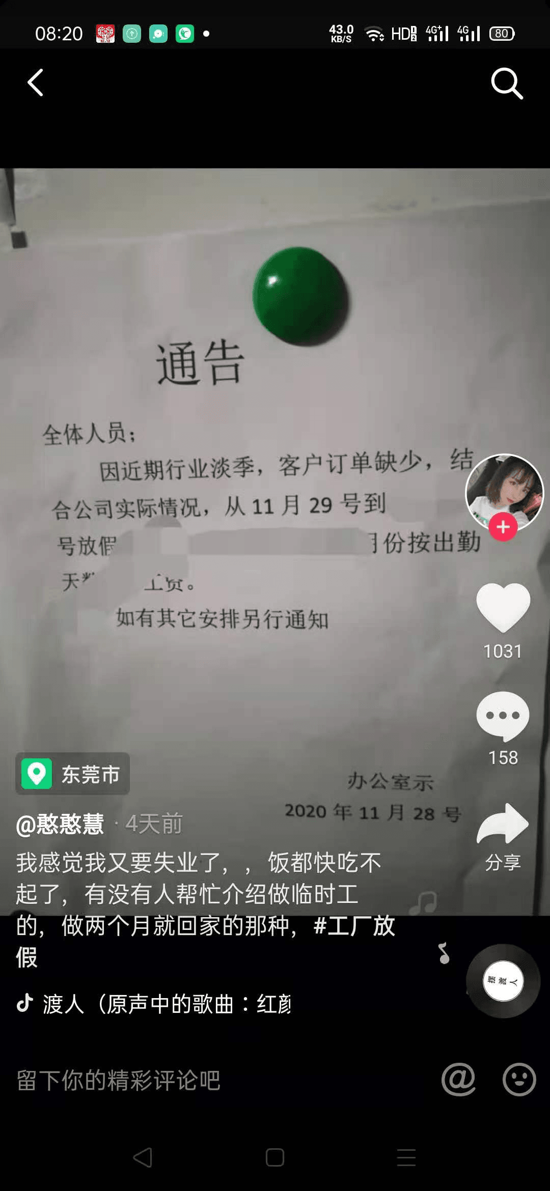 外貿(mào)企業(yè)淡季到來(lái),放假來(lái)的比往年早?據(jù)水泥人網(wǎng)了解,近期外貿(mào)工廠通知提前放假的情況并不在少數(shù)。溫州一鞋廠發(fā)布放假通知,稱因全球疫情影響,鞋廠生產(chǎn)需作調(diào)整,決定從2020年12月1日暫停生產(chǎn),提前放年假。通知還稱,從2020年12月1日與員工協(xié)商簽訂“暫停勞動(dòng)合同”關(guān)系協(xié)議(即停薪留職)。