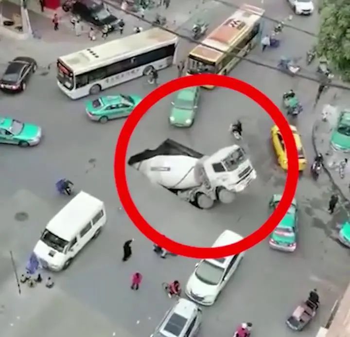 一輛攪拌車后半車身陷入坑中,車頭翹起懸在空中,攪拌車司機已脫困,無人員傷亡。