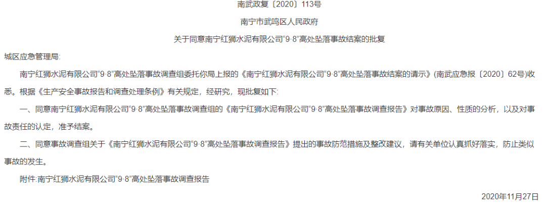 南寧紅獅水泥有限公司“9·8”高處墜落事故調(diào)查報告顯示,2020年9月8日12時48分許,位于南寧市武鳴區(qū)寧武鎮(zhèn)的南寧紅獅水泥有限公司發(fā)生高處墜落事故,導致1人死亡。