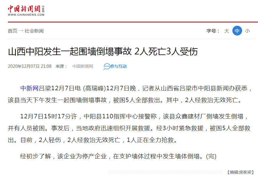 12月7日晚,記者從山西省呂梁市中陽縣新聞辦獲悉,該縣當天下午發生一起圍墻倒塌事故,被困5人全部救出。其中,2人經救治無效死亡。