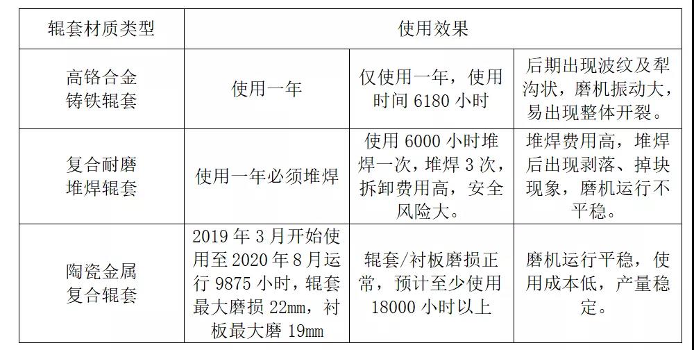 自從使用陶瓷金屬復合輥套/襯板以來,煤磨運行平穩、臺產穩定、耐磨件維護工作量小,極大地減少了員工勞動強度、降低了安全風險與運行成本等。