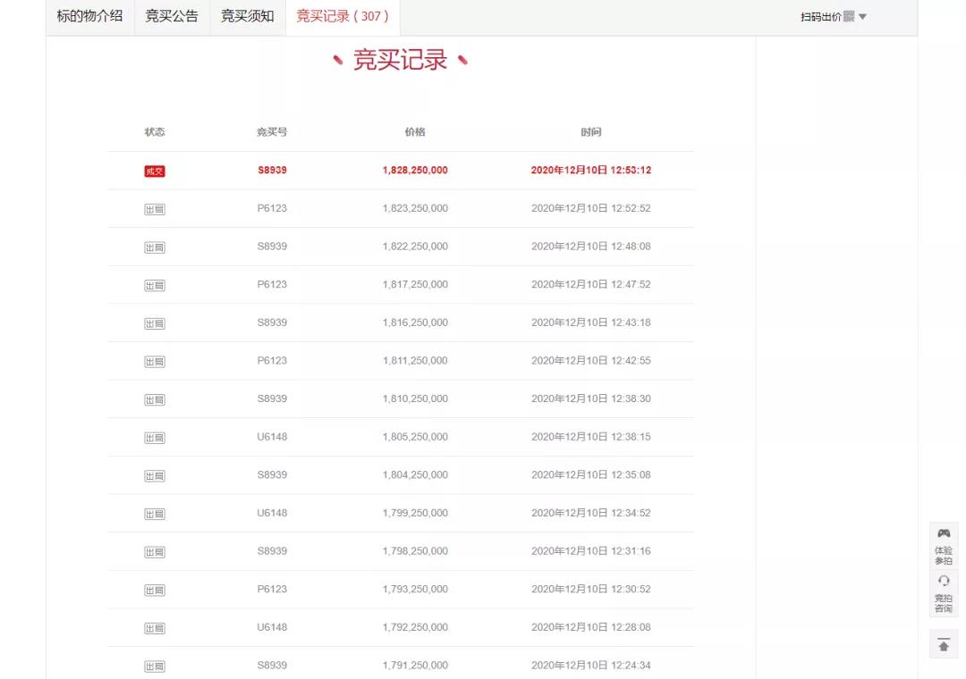 截至上午9點(diǎn)半,競(jìng)拍價(jià)還停留在8.95億元,1分鐘后,Y5133號(hào)競(jìng)買人率先加價(jià)1百萬元打破了僵局,隨后U6148、S8939號(hào)也開始試探性地逐步加價(jià),當(dāng)Y5133號(hào)加價(jià)至9億元時(shí),S8939號(hào)再也按捺不住沖天的豪氣,直接加價(jià)1億元,競(jìng)拍價(jià)一下子突破10億元大關(guān)!