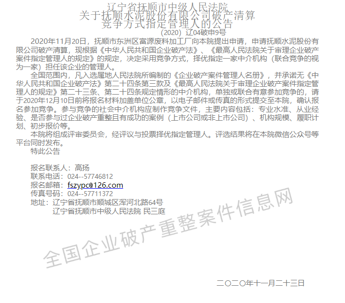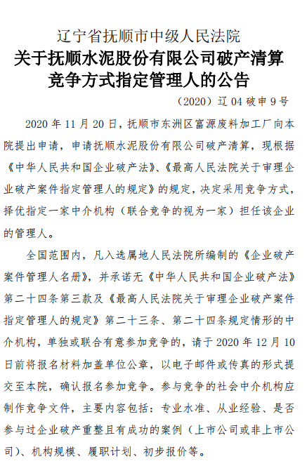 一、遼寧撫順水泥股份有限公司存產清算競爭方式指定管理人