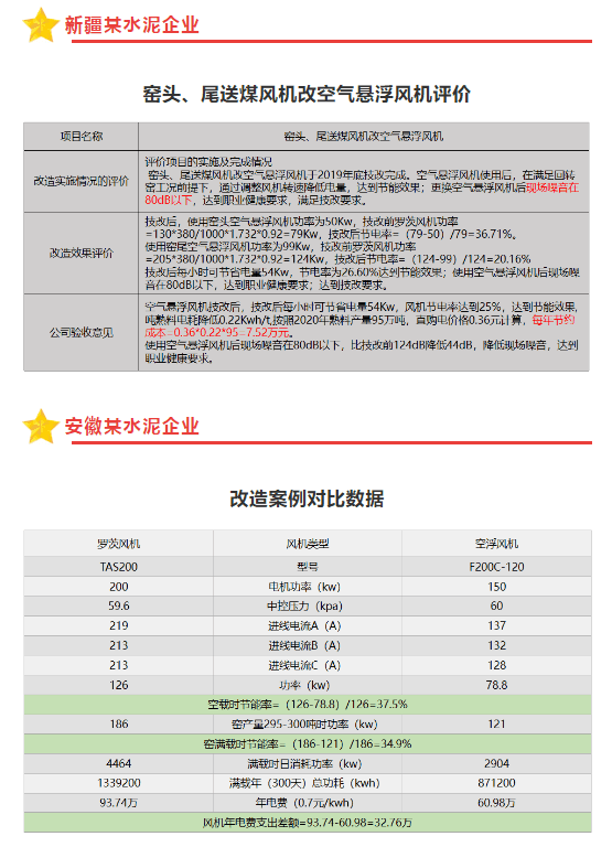 經測試:管道壓力27KPa運行時(與羅茨風機管道壓力相同),空氣懸浮風機節能32.5%。1、同等工況運行時,空氣懸浮風機比羅茨風機功率節能30%以上。2、空氣懸浮風機引用高效葉輪直接連接功能,省去了中間傳動裝置,具有無機械接觸、無振動、無需潤滑、易于按裝等特性,其噪聲由原先110分貝降低到78分貝,遠低于國家規定噪音限值80分貝,同時減少了對設備維護保養頻率,節省潤換系統使用的潤換油,避免生產現場的二次污染等。