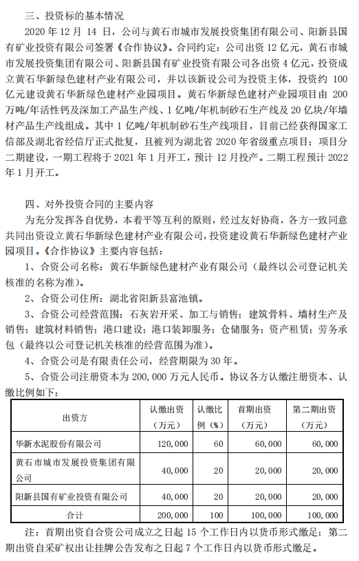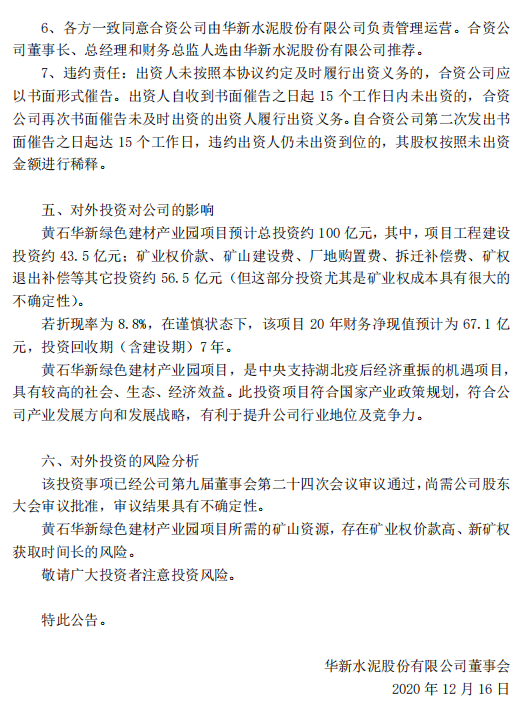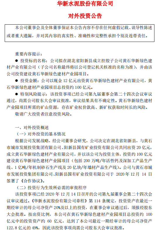 按出資比例,公司在黃石華新綠色建材產業園項目總投資約100億元中的投資資產約60億元,達到了公司最近一期經審計的母公司凈資產122.8億元的49%,因此該投資事項尚需公司股東大會審議批準。