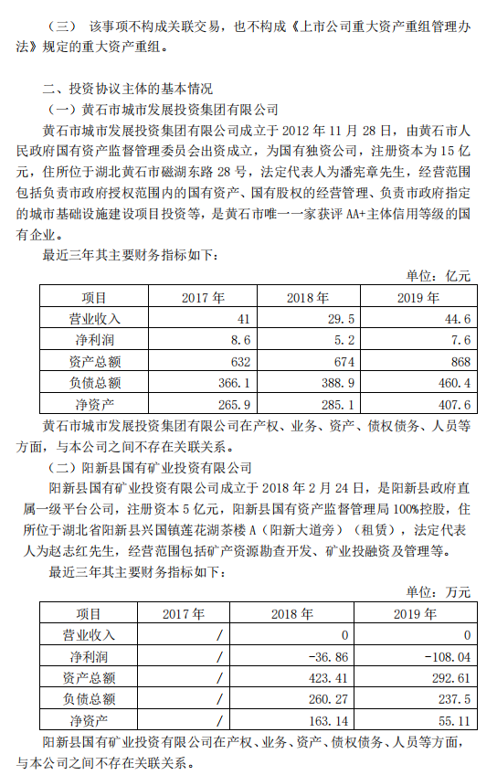 公司與黃石市城市發展投資集團有限公司、陽新縣國有礦業投資有限公司于2020年12月14日簽署了《合作協議》。