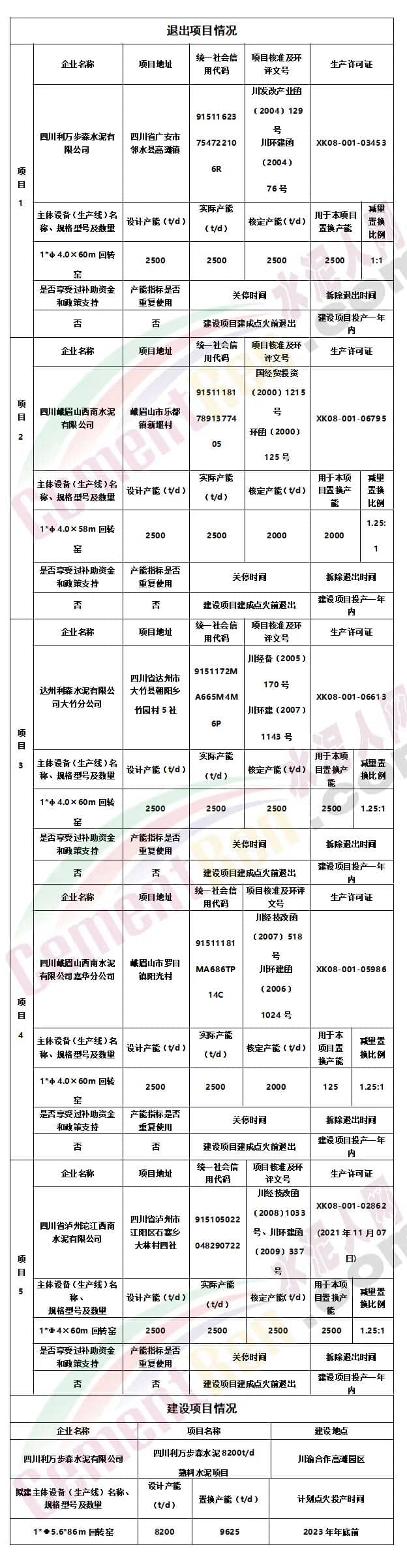 公示文件稱,將退出五條生產線共計9625t/d熟料生產線按照1:1.25置換比例進行產能置換,用于新建一條日產8200噸的新型干法水泥熟料生產線(窯徑Ф5.6m)。 建設地點位于川渝合作高灘園區,新建線計劃點火投產時間為2023年年底前,減量置換為例為1:1.25。