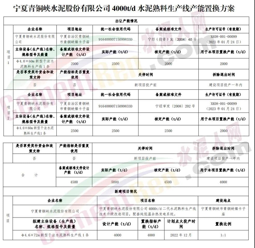 寧夏青銅峽水泥股份有限公司水泥熟料生產線產能置換方案