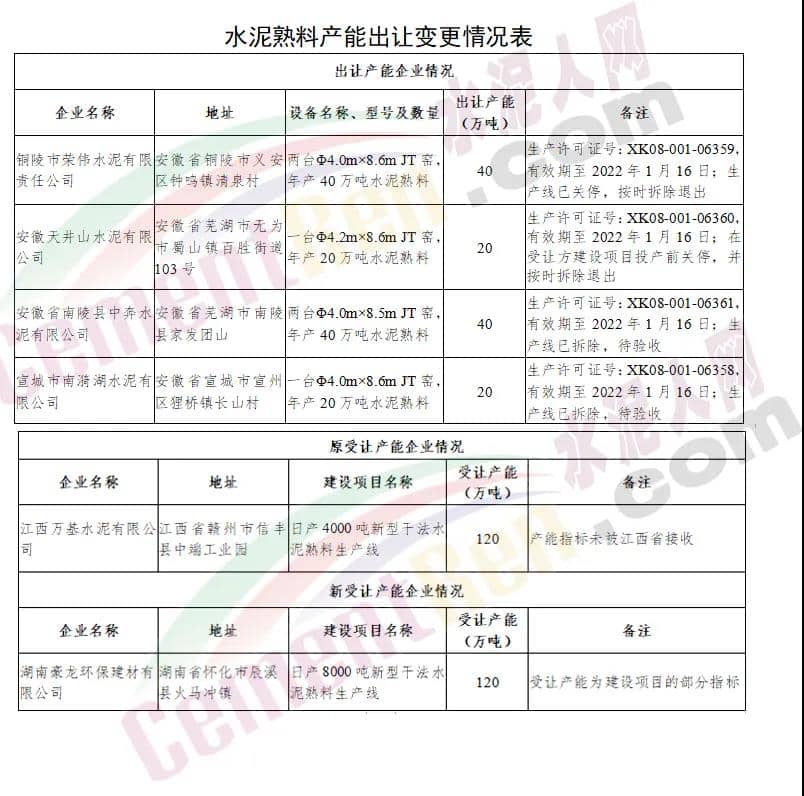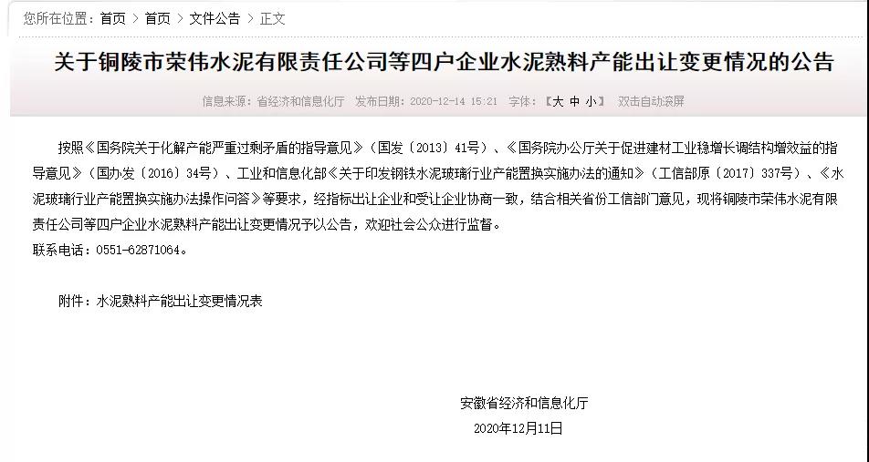 銅陵市榮偉水泥有限責任公司等四戶企業水泥熟料產能出讓變更情況公告