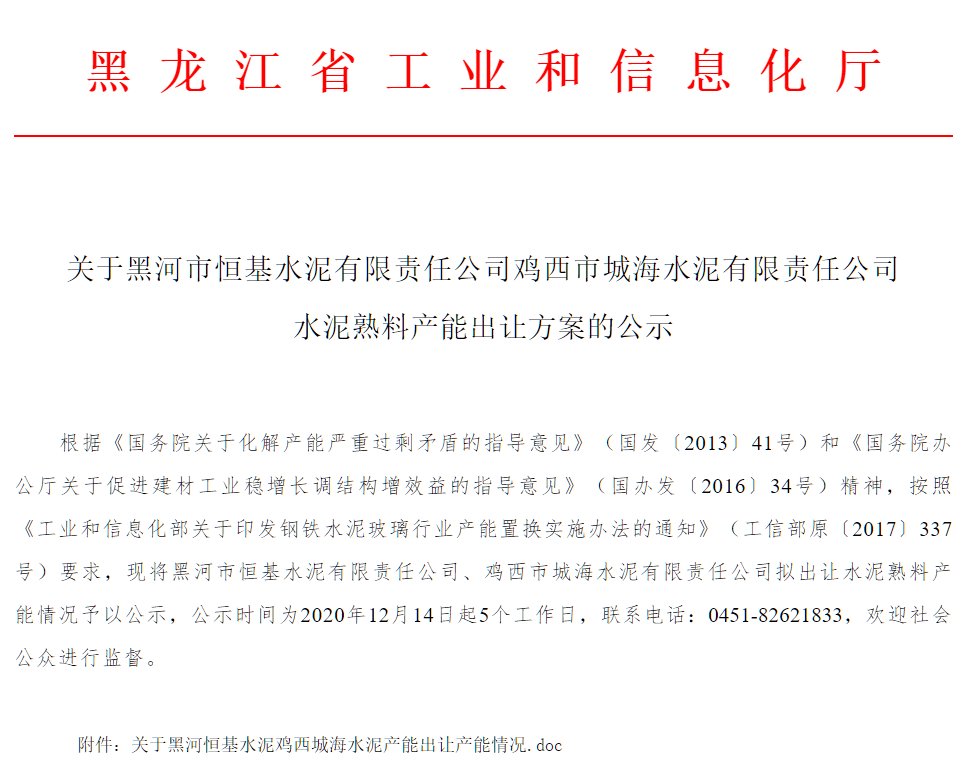 黑龍江省 黑河市恒基水泥有限責任公司雞西市城海水泥有限責任公司水泥熟料產能出讓公示黑龍江省工信廳發布《關于黑河市恒基水泥有限責任公司雞西市城海水泥有限責任公司水泥熟料產能出讓公示》,公示文件顯示,黑河市恒基水泥有限責任公司擬出讓水泥熟料產能1000t/d水泥熟料產能、雞西市城海水泥有限責任公司擬出讓水泥熟料產能1700t/d,用于牡丹江北方遠東水泥有限公司將新建一條5000t/d水泥熟料生產線。退出產能擬除拆時間為2022年7月底,新建項目建設時間為2021年3月31日。