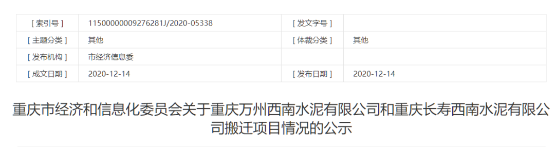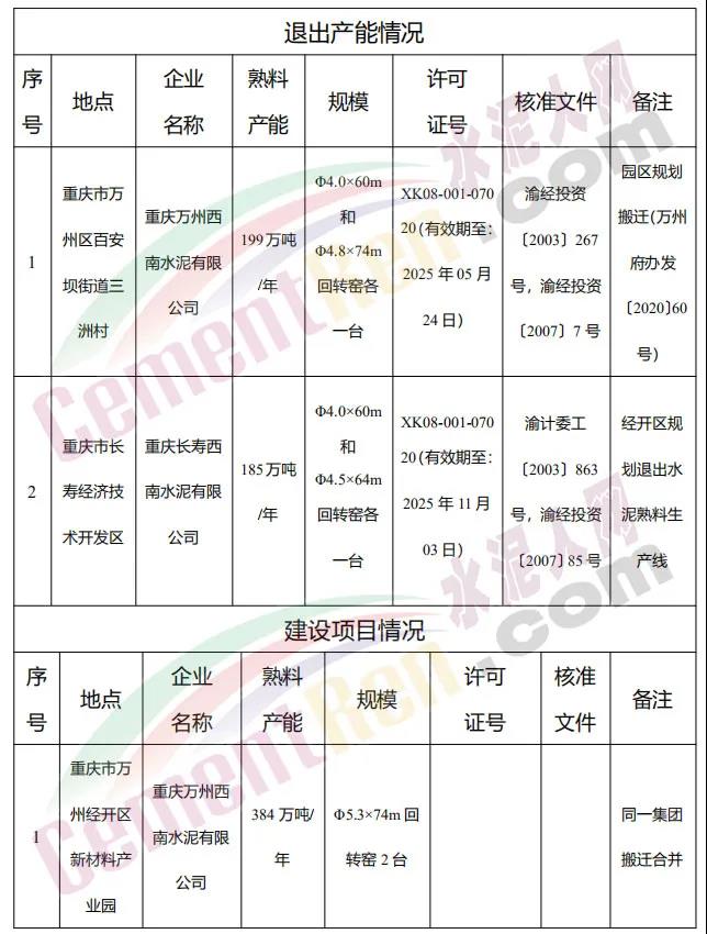 重慶市經信委發布《關于重慶萬州西南水泥有限公司和重慶長壽西南水泥有限公司搬遷項目情況的公示》顯示,重慶萬州西南水泥有限公司兩臺回轉窯(共計199萬噸熟料產能)、重慶長壽西南水泥有限公司兩臺回轉窯(共計185萬噸熟料產能)將合并搬遷至萬州經開區,建設Φ5.3×74m回轉窯2臺,產能合計為384萬噸/年。按照工信部此前公示的《水泥熟料產能換算表》外徑Φ5.3的回轉窯熟料產能約為6500t/d左右。公示原文如下: