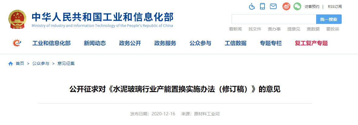 為進(jìn)一步聽(tīng)取社會(huì)各界意見(jiàn),現(xiàn)予以公示,公示日期截止2021年1月19日。如有意見(jiàn)或建議,請(qǐng)?jiān)诠酒陂g填寫(xiě)《公示意見(jiàn)反饋信息表》(見(jiàn)附件2)并反饋至工業(yè)和信息化部原材料工業(yè)司,電子郵件發(fā)送至yclsjcc@miit.gov.cn(郵件主題注明:水泥玻璃行業(yè)產(chǎn)能置換實(shí)施辦法公示意見(jiàn)反饋)。