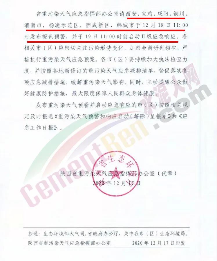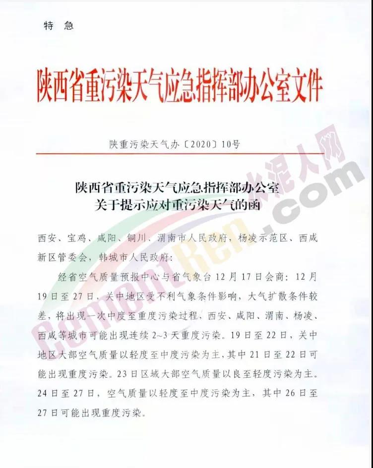 日前,陜西省重污染天氣應急指揮部公室發布特急文件《關于提示應對重污染天氣的函》( 陜重污染天氣辦〔2020〕10號)要求西安、寶雞、咸陽、銅川、渭南市,楊凌示范區、西咸新區、韓城市等8個區域于12 月18日 11∶00時發布橙色預警,并于19日11∶00時前啟動Ⅱ級應急響應。
