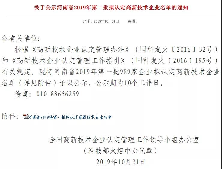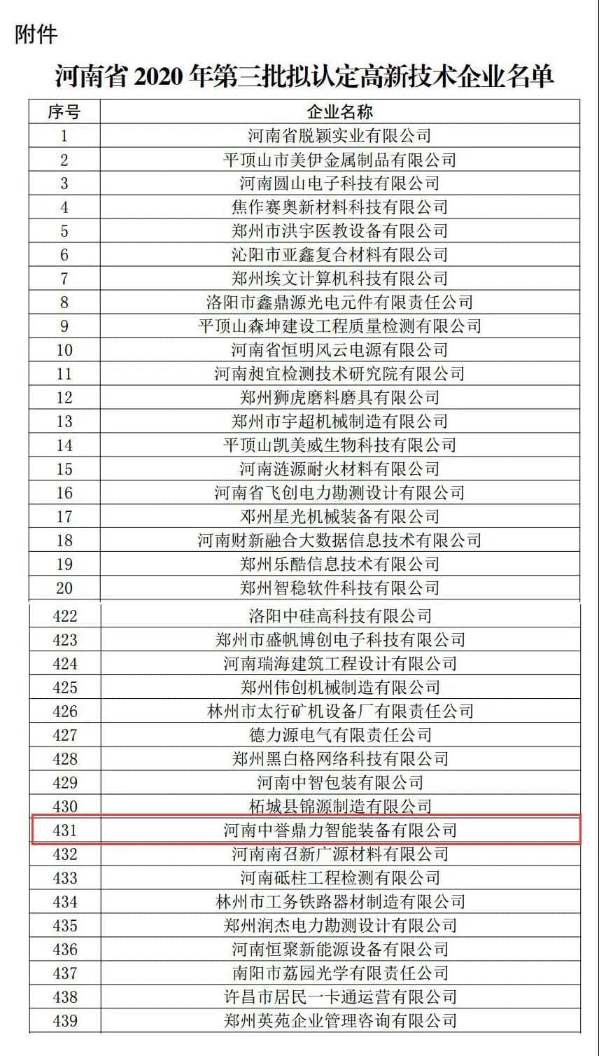 根據(jù)國家《高新技術(shù)企業(yè)認(rèn)定管理辦法》(國科發(fā)火〔2016〕32號)和《高新技術(shù)企業(yè)認(rèn)定管理工作指引》(國科發(fā)火〔2016〕195號)有關(guān)規(guī)定,全國高新技術(shù)企業(yè)認(rèn)定管理工作領(lǐng)導(dǎo)小組辦公室12月初在官方網(wǎng)站對河南省2020年第三批擬認(rèn)定高新技術(shù)企業(yè)名單進(jìn)行公示。經(jīng)過為期10天的公示階段,河南中譽鼎力智能裝備有限公司順利通過“國家高新技術(shù)企業(yè)”認(rèn)定。