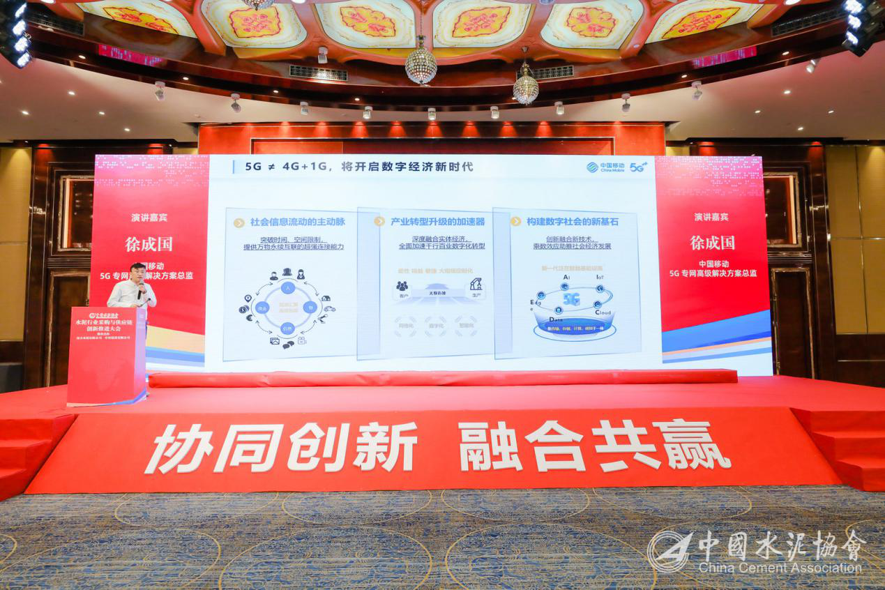 中國(guó)移動(dòng)5G專網(wǎng)解決方案專家徐成國(guó)于會(huì)上發(fā)言,介紹了中國(guó)移動(dòng)1+1+N的5G智慧供應(yīng)鏈能力體系,即1張5G專網(wǎng),1個(gè)供應(yīng)鏈平臺(tái),N項(xiàng)智慧應(yīng)用,闡述了中國(guó)移動(dòng)如何從產(chǎn)品設(shè)計(jì)、生產(chǎn)、物流、交付全流程對(duì)水泥行業(yè)供應(yīng)鏈進(jìn)行重塑,利用5G技術(shù)打造水泥行業(yè)生產(chǎn)制造少人化、多元化,倉(cāng)儲(chǔ)物流數(shù)字化、智能化,實(shí)現(xiàn)配送“最后一公里”無(wú)人化等新場(chǎng)景,并重點(diǎn)介紹了5G智慧礦山、5G智慧工廠、5G智慧倉(cāng)儲(chǔ)、5G智慧港口、5G智慧園區(qū)、5G智慧零售等多項(xiàng)慧應(yīng)用。