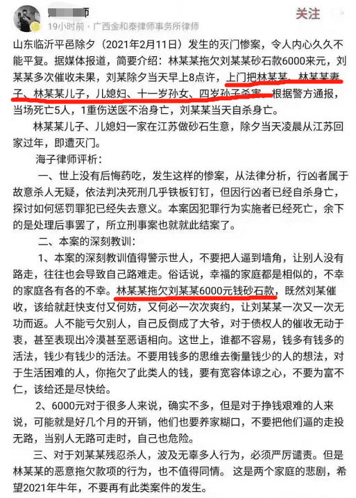 在評論區有知情人透露,這樣一起惡性案件源于6000元的要賬,死者一家分別是年逾五旬的夫婦、兒子兒媳,孫子孫女,相當于一家6口滅門。犯罪嫌疑人自己也已經自殺身亡。