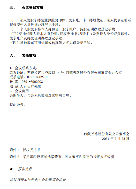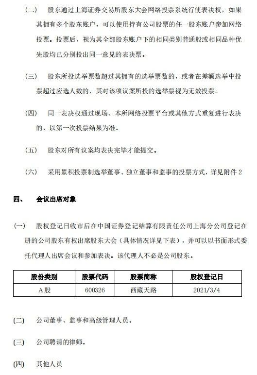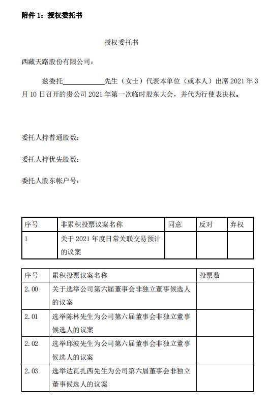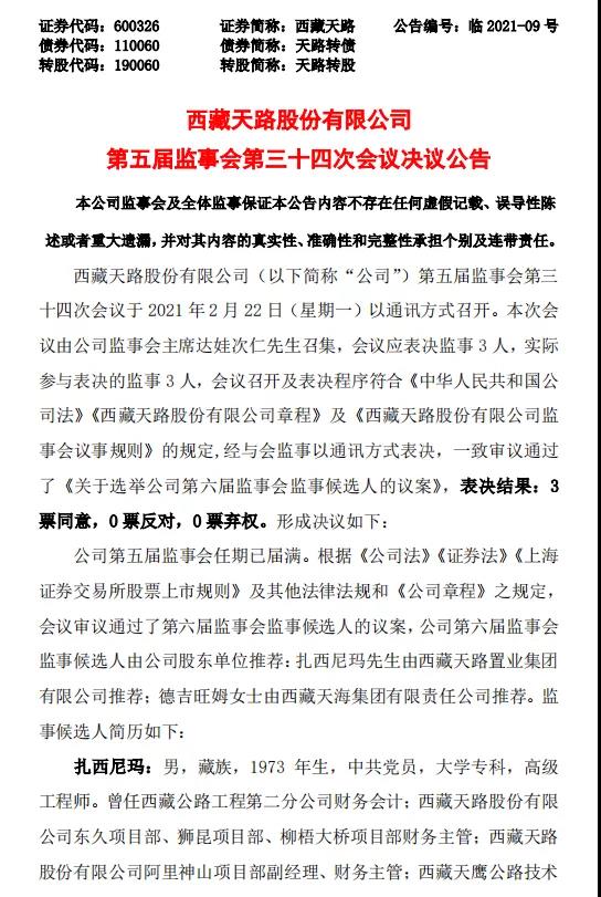 公司第五屆監(jiān)事會任期已屆滿。根據(jù)《公司法》《證券法》《上海證券交易所股票上市規(guī)則》及其他法律法規(guī)和《公司章程》之規(guī)定,會議審議通過了第六屆監(jiān)事會監(jiān)事候選人的議案,公司第六屆監(jiān)事會監(jiān)事候選人由公司股東單位推薦:扎西尼瑪先生由西藏天路置業(yè)集團有限公司推薦;德吉旺姆女士由西藏天海集團有限責任公司推薦。