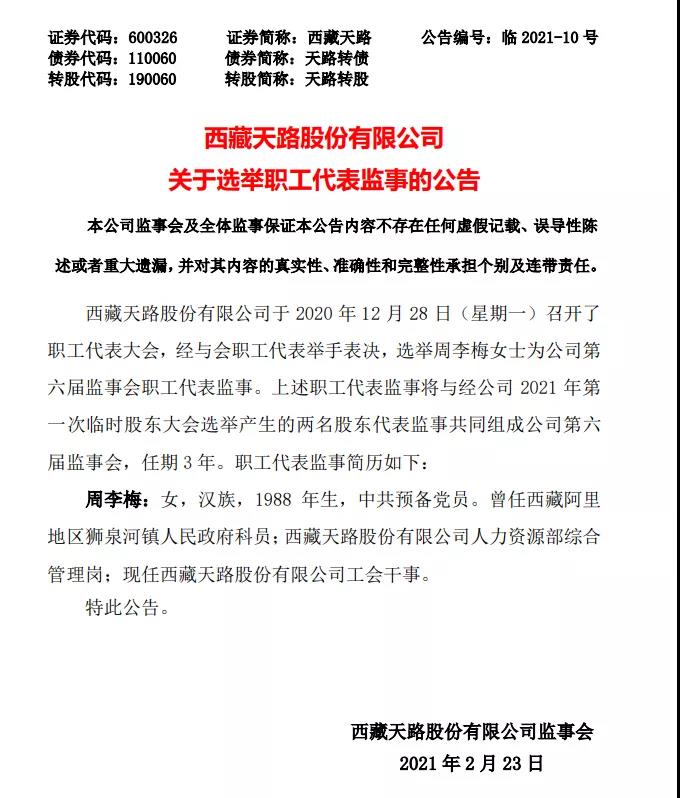 西藏天路股份有限公司于2020年12月28日(星期一)召開了職工代表大會,經(jīng)與會職工代表舉手表決,選舉周李梅女士為公司第六屆監(jiān)事會職工代表監(jiān)事。上述職工代表監(jiān)事將與經(jīng)公司2021年第一次臨時股東大會選舉產(chǎn)生的兩名股東代表監(jiān)事共同組成公司第六屆監(jiān)事會,任期3年。