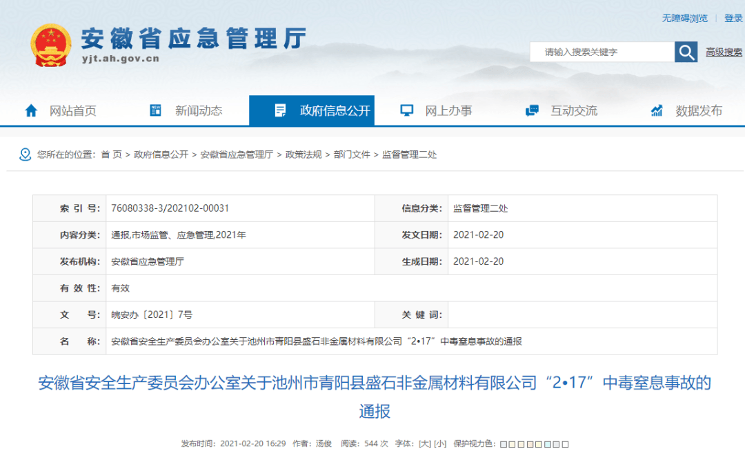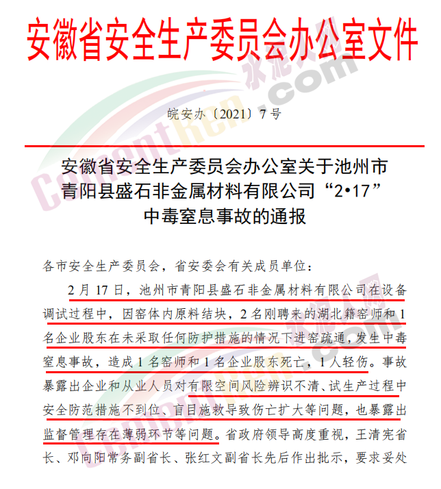日前,安徽省應急管理廳發布《安徽省安全生產委員會辦公室關于池州市青陽縣盛石非金屬材料有限公司“2•17”中毒窒息事故的通報》。