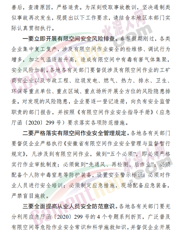春節假期剛過,各類企業集中復工復產,涉及有限空間作業安全的檢維修、調試行為增多,加之氣溫逐漸升高,造成有限空間中有毒有害氣體集聚,安全風險加劇。各地各有關部門要督促涉及有限空間作業的工礦商貿企業以及市政工程、垃圾發電、燃氣、熱力、排水、衛生、環保等重點單位、重點區域、重點場所開展全方位的風險隱患排查。對發現的風險隱患,企業要逐一登記造冊,向負有安全監管職責的部門報告,并按照《有限空間作業安全指導手冊》(應急廳函〔2020〕299號)要求落實各項防范措施。