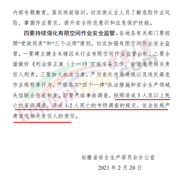各地各有關部門要按照“黨政同責”和“三個必須”原則,切實加強有限空間作業安全監管。一要建立健全本轄區本行業有限空間作業監管臺帳。二要全面做好《刑法修正案(十一)》實施準備工作,依法追究相關責任人刑責。三要加大執法力度,嚴厲查處違法違規以及違反高危作業規程等行為,嚴格落實“四個一律”執法措施和安全生產領域失信聯合懲戒制度。四要嚴格事故調查,按照造成3人及以上死亡的省級調查,造成1-2人死亡的市級調查的規定,依法依規嚴肅追究相關責任人的責任。
