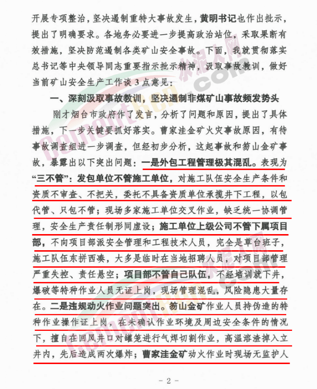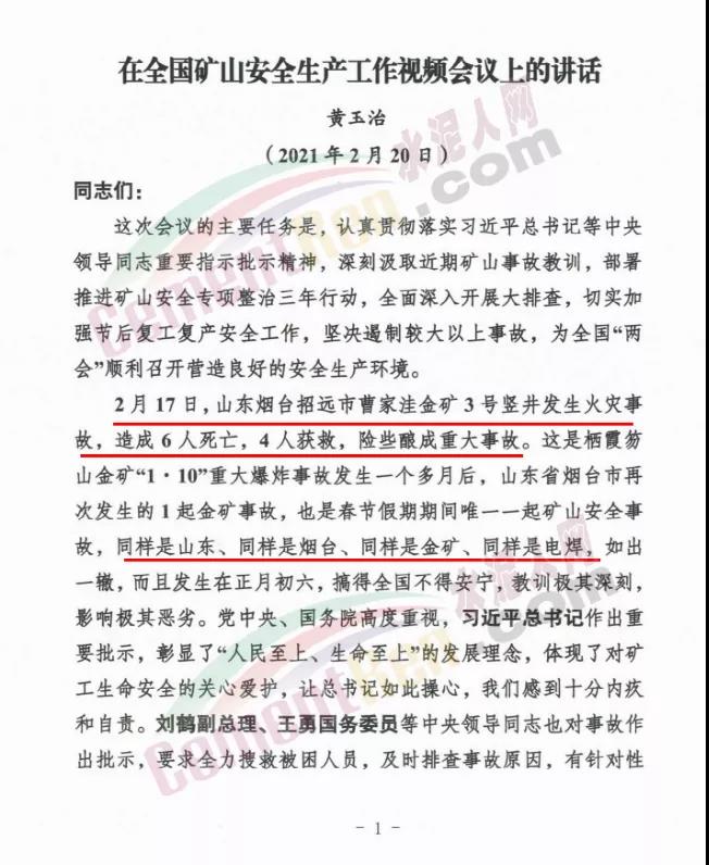 水泥人網(wǎng)通訊員消息,近日,應(yīng)急管理部副部長(zhǎng)、國(guó)家礦山安監(jiān)局局長(zhǎng)黃玉治在全國(guó)礦山安全生產(chǎn)工作視頻會(huì)議上發(fā)表講話時(shí)提到,2月17日,山東煙臺(tái)招遠(yuǎn)市曹家洼金礦3號(hào)豎井發(fā)生火災(zāi)事故,造成6人死亡,4人獲救,險(xiǎn)些釀成重大事故。這是繼棲霞笏山金礦“1?10”重大爆炸事故發(fā)生一個(gè)多月后,山東省再次發(fā)生的1起金礦事故,也是春節(jié)假期期間唯一一起礦山安全事故,同樣是山東、同樣是煙臺(tái)、同樣是金礦、同樣是電焊,如出一轍,而且發(fā)生在正月初六,搞得全國(guó)不得安寧,教訓(xùn)極其深刻,影響極其惡劣。
