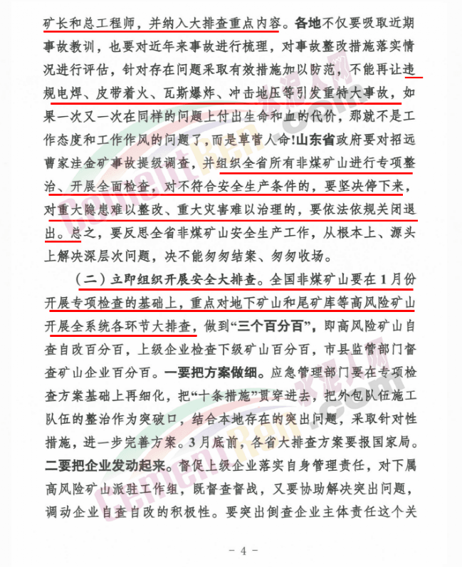 針對(duì)于礦山事故多發(fā),國(guó)務(wù)院及應(yīng)急管理部相關(guān)領(lǐng)導(dǎo)要求以清理整治違規(guī)外包隊(duì)伍為突破口,立即組織對(duì)地下非煤礦山和尾礦庫(kù)開(kāi)展全系統(tǒng)各環(huán)節(jié)大排查,做到高風(fēng)險(xiǎn)礦山自查自改、上級(jí)企業(yè)檢查下級(jí)礦山、市縣監(jiān)管部門(mén)督查礦山“三個(gè)百分百”。