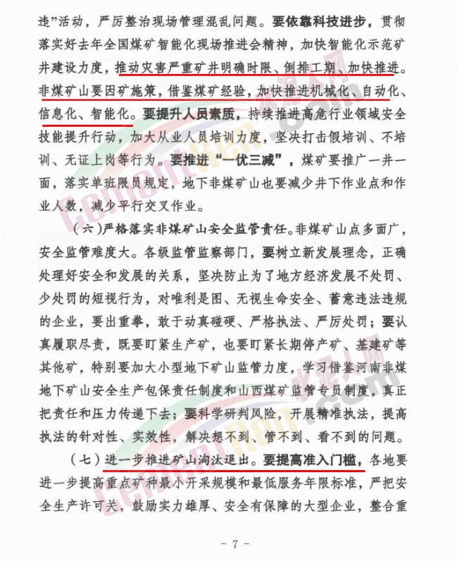 進(jìn)一步推進(jìn)礦山淘汰退出。提高準(zhǔn)入門(mén)檻,各地要進(jìn)一步提高重點(diǎn)礦種最小開(kāi)采規(guī)模和最低服務(wù)年限標(biāo)準(zhǔn),嚴(yán)把安全生產(chǎn)許可關(guān),鼓勵(lì)實(shí)力雄厚、安全有保障的大型企業(yè),整合重組不具備安全生產(chǎn)條件的小型礦山。