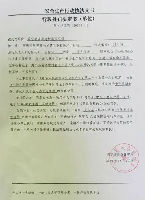 附件:周寧縣應(yīng)急管理局行政處罰決定書