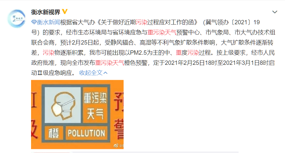 根據省大氣污染防治工作領導小組辦公室《關于做好近期污染過程應對工作的函》(冀氣領辦函〔2021〕19號),結合市生態環境局、氣象局與大氣專家團隊聯合分析研判,預計2月26日-28日,受南風、高濕、靜穩等不利氣象擴散條件影響,污染積累,我市將出現以一次以細顆粒物為首要污染物的中至重度污染過程。為保障人民群眾身體健康,市政府決定發布重污染天氣橙色預警,自26日8時啟動II級應急響應,解除時間為3月1日8時(若有變化另行通知)。