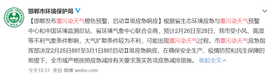 根據省生態環境應急與重污染天氣預警中心和中國環境監測總站、省環境氣象中心聯合會商,預計2月26日至28日,我市受小風、高濕等不利氣象條件影響,大氣擴散條件較為不利,可能出現重污染天氣過程。市重污染天氣應急指揮部決定2月25日8時至3月1日8時啟動Ⅱ級應急響應,在確保安全生產、疫情防控和民生保障的前提下,全市域嚴格按照應急減排有關要求落實各項應急減排措施。