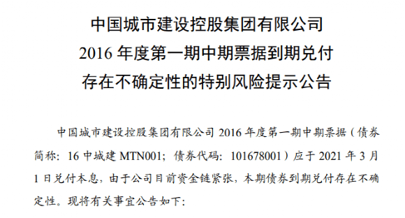 日前,中國(guó)城市建設(shè)控股集團(tuán)有限公司(簡(jiǎn)稱“中城建”)發(fā)布提示公告,“16中城建MTN001”債券于2021年3月1日到期,因資金鏈緊張存在不能兌付的可能性,而從發(fā)行之日起,該筆債權(quán)幾乎從未按時(shí)兌付,已構(gòu)成多次實(shí)質(zhì)性違約,此次違約將大概率出現(xiàn)。債權(quán)人稱中城建名下已無資產(chǎn),而多年來中城建遍尋合作方未果。