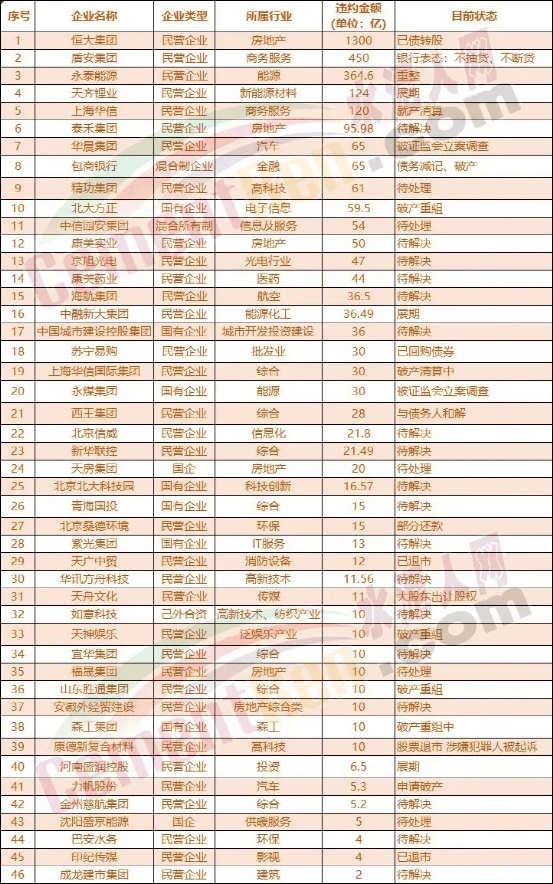 2020年涉及債務(wù)違約的企業(yè)達(dá)到46家,其中成功化解債務(wù)危機(jī)的有4家,已經(jīng)實(shí)際發(fā)生債務(wù)違約的有42家,而這42家公司違約債券規(guī)模約1600億元。就行業(yè)分布來看,除去綜合類外,債券違約分布最大的行業(yè)要數(shù)房地產(chǎn)業(yè)。永煤集團(tuán)10.32億元票據(jù)違約;華晨汽車集團(tuán)總負(fù)債1328.44億元,宣告破產(chǎn)重整;北大方正集團(tuán)走下“神壇”,進(jìn)行重整;紫光集團(tuán)4.5億票據(jù)違約……部分龍頭企業(yè)違約情況如下表所示: