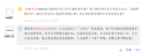 海螺水泥上市公司回復稱,公司已制定了“十四五”發展規劃。鑒于信息披露規則要求和商業保密原則,有關具體數據不便告知。在投資發展方面,公司將會堅守水泥主業,全力以赴謀發展,穩妥推進國際化發展戰略,大力延伸上下游產業鏈,積極尋求并購標的。