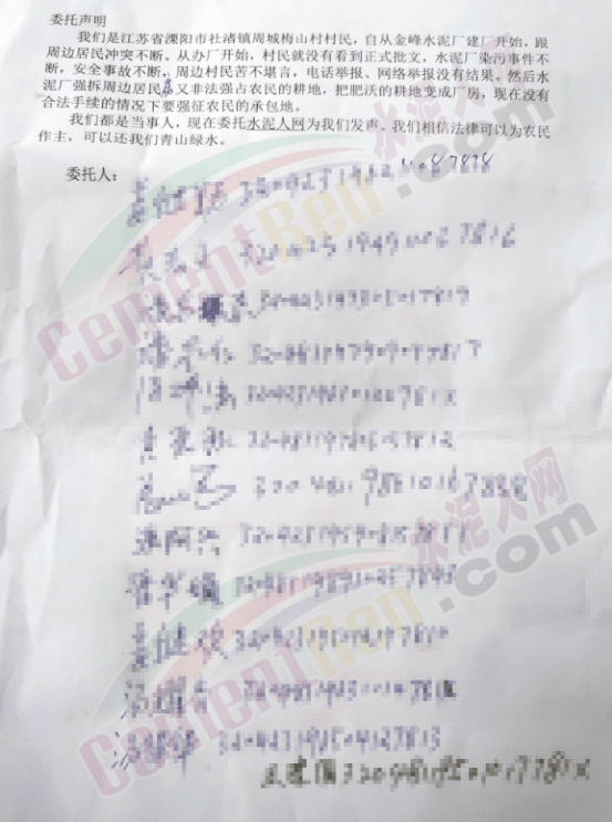 委托聲明中提到“我們都是當事人,現在委托水泥人網為我們發聲,我們相信法律可以為農民作主,可以還我們青山綠水”。