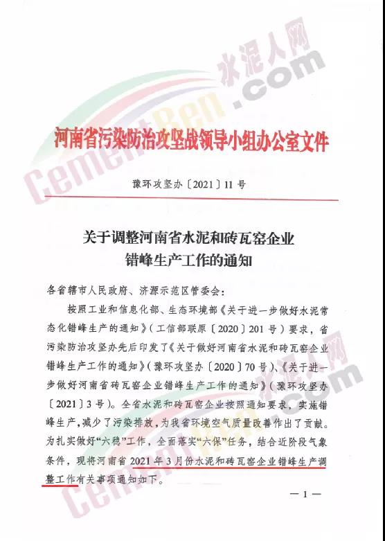 日前河南省污染防治攻堅戰領導小組辦公室發布《關于調整河南省水泥和磚瓦窯企業錯峰生產工作的通知》文件給各省轄市人民政府、濟源示范區管委會將河南省2021年3月份水泥和磚瓦窯企業錯峰生產調整工作有關事項作出安排。