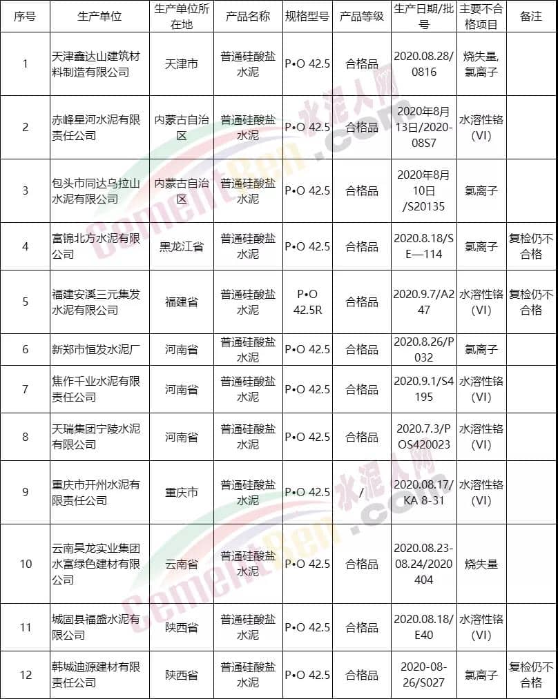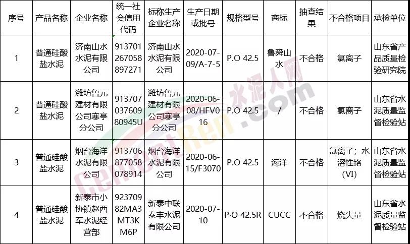 山東省市場監督管理局2020年水泥產品質量省級監督抽查結果, 發現4家企業的4批次PO42.5產品不符合相關標準的要求,不合格項目為氯離子、燒失量、水溶性鉻(VI)等項目。