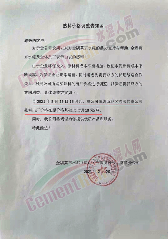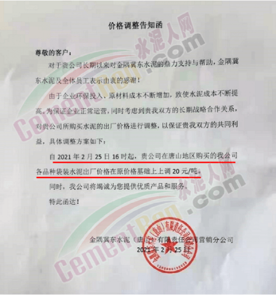 根據(jù)當前市場情況的變化,經(jīng)公司研究決定:從2021年3月2日零時起,各品種等級袋/散裝水泥及旋窯熟料分別在原價格基礎上上調(diào)20元/噸。不便之處,敬請諒解。