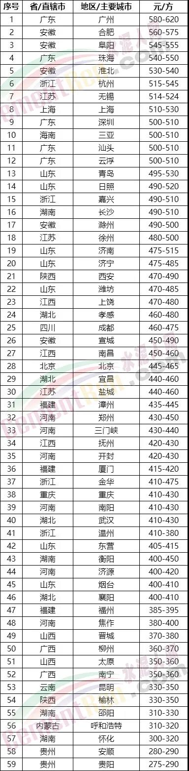 混凝土方面,報價相對較高的區(qū)域在華南珠三角及周邊以及華東長三角及周邊區(qū)域,報價多在500-650元/方之間;價格相對較低的區(qū)域為西南云南、貴州、廣西和山西地區(qū),均價多在400元/方以下,其中貴州貴陽地區(qū)報價275-290元/方。