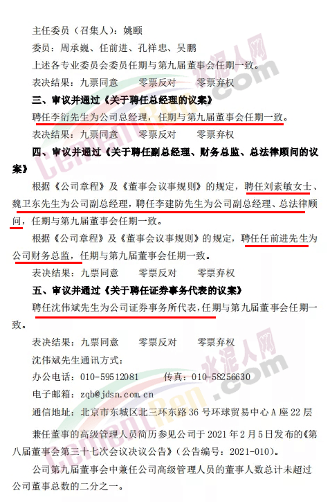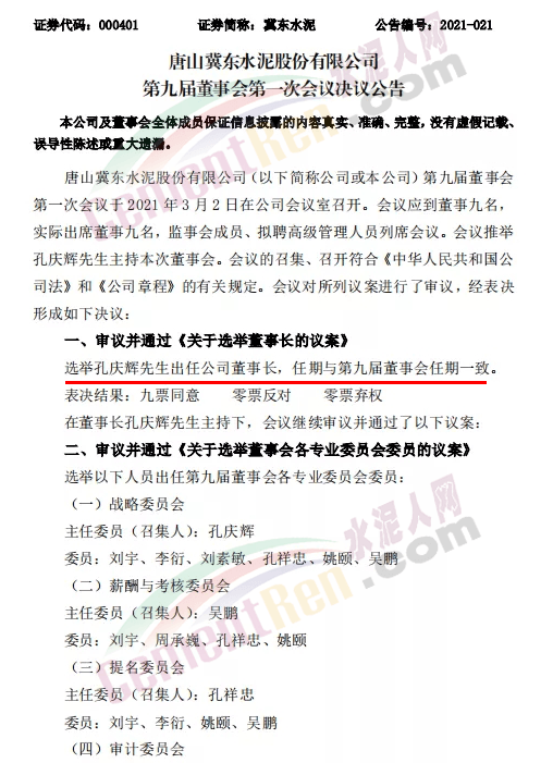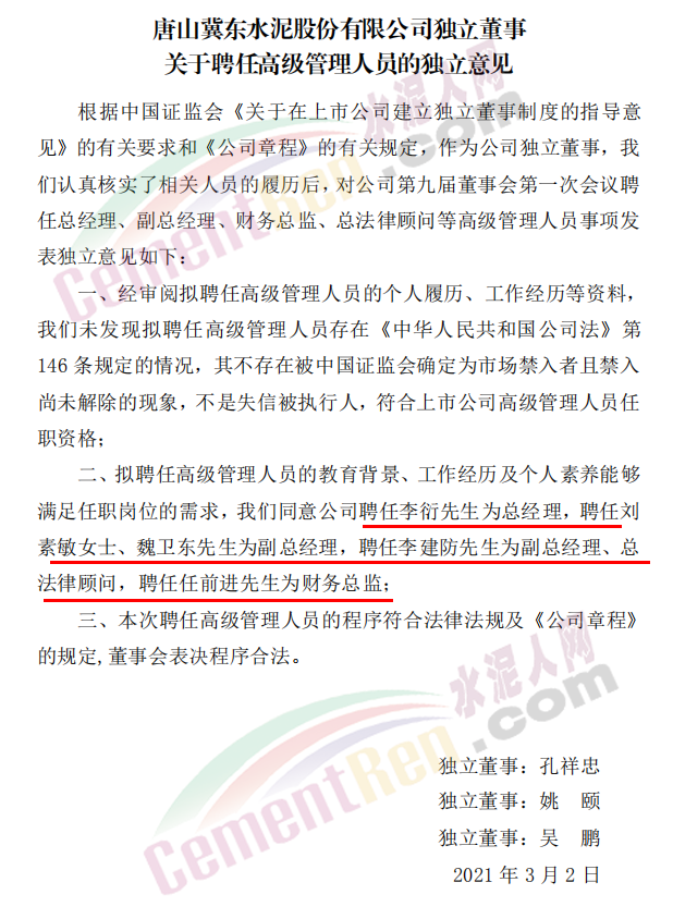 3月2日晚間唐山冀東水泥上市公司連發五條公告,內容為董事長、總經理、監事會主席,以及其他高級管理人員的選舉及任命。