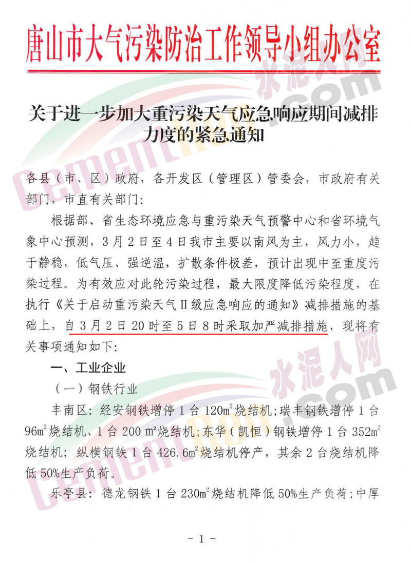 據水泥人網了解:日前,唐山市大氣污染防治工作領導小組辦公室發布《關于進一步加大重污染天氣應急響應期間減排力度的緊急通知》稱,根據部、省生態環境應急與重污染天氣預警中心和省環境氣象中心預測,3月2日至4日唐山市主要以南風為主,風力小,趨于靜穩,低氣壓、強逆溫,擴散條件極差,預計出現中至重度污染過程。
