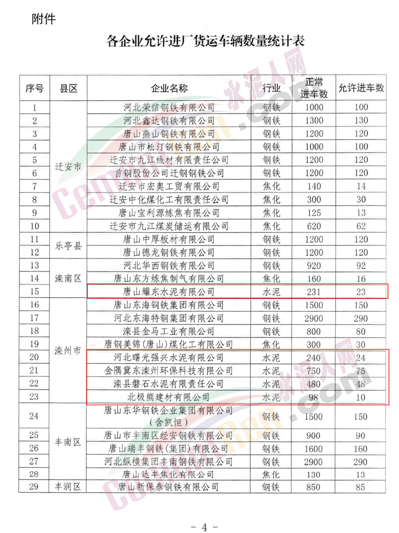 各水泥企業允許進廠貨車輛數量統計表