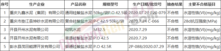 不合格水泥名單顯示,不合格企業包括重慶九鑫水泥(集團)有限公司、重慶市墊江縣坤砂水泥有限公司、開縣開州水泥有限公司、彭水縣茂田能源開發有限公司等四家企業5個批次,其中42.5級水泥4個批次,32.5級水泥1個批次,生產日期均為2020年7月份。