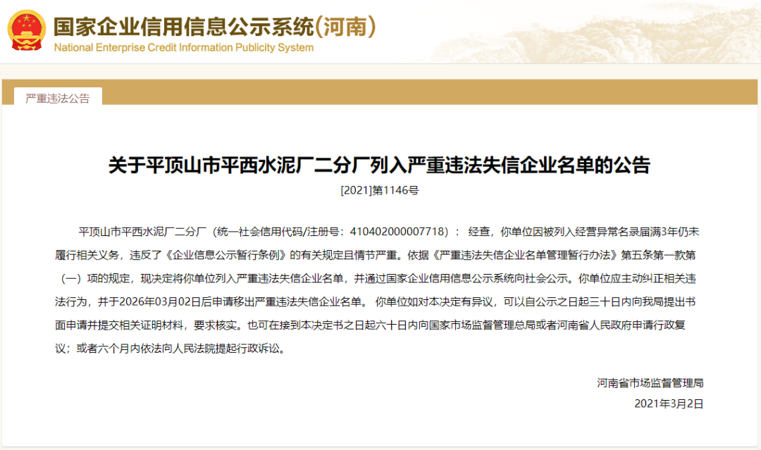日前,水泥人網(wǎng)從國家企業(yè)信用信息公示系統(tǒng)獲悉,2021年3月2日,河南省市場監(jiān)督管理局發(fā)布關(guān)于平頂山市平西水泥廠二分廠列入嚴(yán)重違法失信企業(yè)名單的公告([2021]第1146號)。