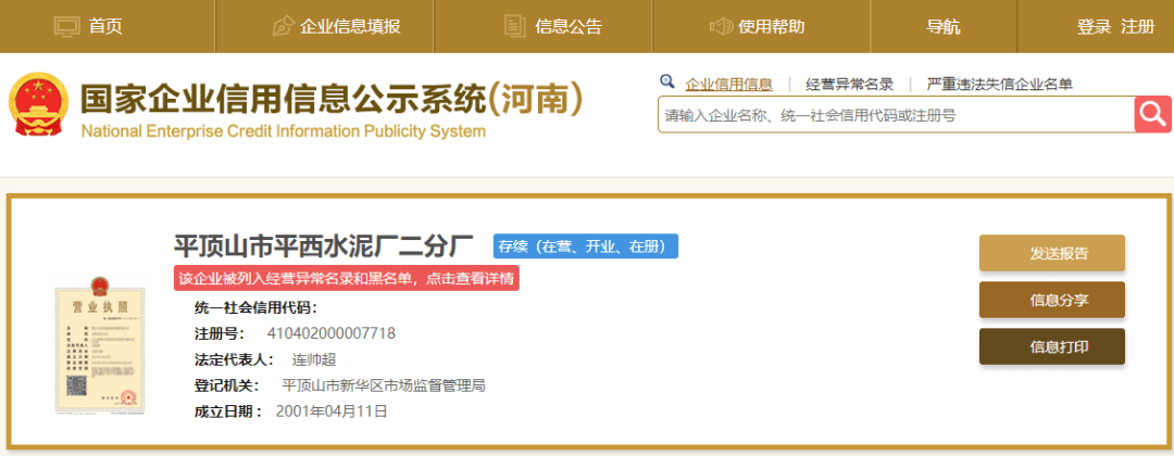 經(jīng)查,平頂山市平西水泥廠二分廠(統(tǒng)一社會信用代碼/注冊號:410402000007718)因被列入經(jīng)營異常名錄屆滿3年仍未履行相關(guān)義務(wù),違反了《企業(yè)信息公示暫行條例》的有關(guān)規(guī)定且情節(jié)嚴(yán)重。依據(jù)《嚴(yán)重違法失信企業(yè)名單管理暫行辦法》第五條第一款第(一)項的規(guī)定,河南省市場監(jiān)督管理局現(xiàn)決定將平頂山市平西水泥廠二分廠列入嚴(yán)重違法失信企業(yè)名單,并通過國家企業(yè)信用信息公示系統(tǒng)向社會公示。
